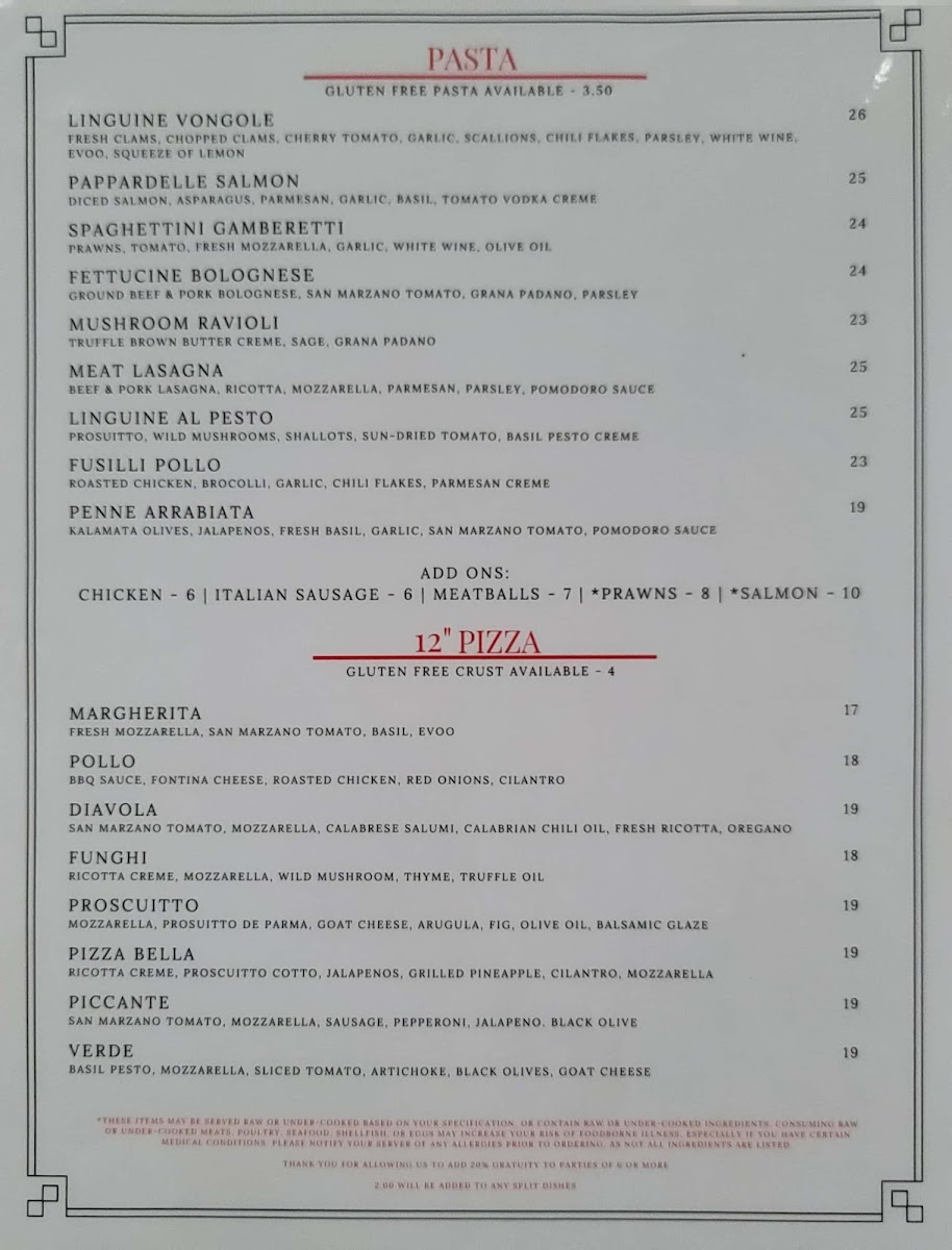 Start with light bites like Burrata Bruschetta or Crispy Calamari, perfect for sharing over conversation. The selection of fresh salads such as Beet Salad or Pear Salad provides a refreshing balance to heartier entrées. From rich Chicken Parmigiana and Chicken Piccata to house-specialty ravioli and Margherita Pizza, the menu supports a range of tastes and appetites, fitting well with the warm, welcoming atmosphere.